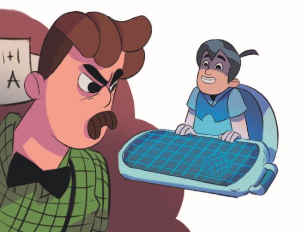 – «Средневековые пытки»… Нет, слишком жестоко. «Игра на волынке»… Хм, интересно, но тебе может понравиться… А, вот! – Его палец, бежавший по строчкам, остановился. – К завтрашнему утру напишешь пятьсот раз от руки: «Я живу на астероиде, где не играют в Космобол. Я должен вести себя тихо и знать своё место». И чтоб без роботов, смотри у меня!