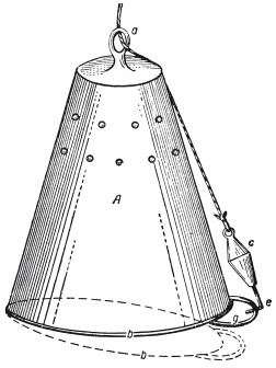 Для ловли с берега во Франции употребляется большей частью приспособление вроде жерлицы, представляющее те же выгоды, так как рыба не может наколоться на крючок и, не чувствуя сопротивления, редко бросает насадку, что случается очень часто при ужении на несколько удильников. Приспособление это совершенно понятно из прилагаемого рисунка: когда рыба, взяв насадку, потянет за лесу, то плоская катушка, на которую она намотана, поворачивается, ударяет шпеньком по пружинке с бубенчиком, прикрепленной к ножке снаряда, и продолжает разматываться, давая рыбе возможность беспрепятственно удаляться с насадкой и при каждом обороте позванивая бубенчиком. В Англии для ловли со дна на глубоких местах употребляется удилище с катушкой, какое употребляется для ужения с поплавком; разумеется, степень гибкости верхушки удилища должна соответствовать силе течения и зависящей от нее тяжести грузила. Последнее большей частью просверлено и бывает круглое (при легком течении) или плоское (при сильном); крючок обыкновенно привязан к леске из жилок сантиметра в 92 длины, с дробинкой, прищипнутой в 61 см от крючка и не дающей грузилу съезжать дальше. Эта леска пристегивается к тонкому непромокаемому шнурку.
