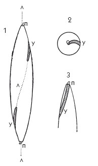 1– вид сбоку: л – леса; п– петельки, поставленные наискось для меньшего перегиба лесы; у– углубления; 2– вид с конца; 3– вид сбоку на одно углубление