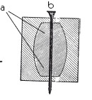 Так как этого рода грузила в продаже у нас совершенно не встречаются, то нелишне описать самый простой способ делать их дома. Берут известковый или другой какой-нибудь мягкий камень и обтесывают одну его сторону как можно тщательнее, так, чтобы получить совершенно ровную поверхность 7,5 см длины, при 5 см ширины; на этой поверхности начерчивают форму грузила и вырезают ее на глубину от 0,6 до 1,3 см. На краях а получившейся формы вырезают по гнезду, в которые вкладывается проволочный гвоздь b (рис. 127); толщина последнего изменяется сообразно с требуемой шириной отверстия грузила, глубина каждого гнезда должна равняться половине глубины формочки плюс половина толщины гвоздя; вложивши гвоздь, гнездо сверху замазывают хлебным мякишем. Формочка наливается вровень с краями свинцом, последнему дают остыть, затем вынимают его и вытаскивают из него гвоздь; если получившееся грузило будет не совсем ровно, можно подровнять его подпилком. Кто не желает возиться с отливкой, тот может впаять в грузило плоской формы медное ушко.