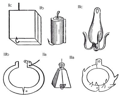 Рис. 128. Приготовление лота. IIa – пирамидальный лот с пробкой в основании; IIb – лот из полоски свинца; IIc – лот из надрезанного кубика свинца; IIIa – раздвижной отцеп с зубцами; IIIb – раздвижной отцеп гладкий; IIIc – отцеп в виде якорька.
