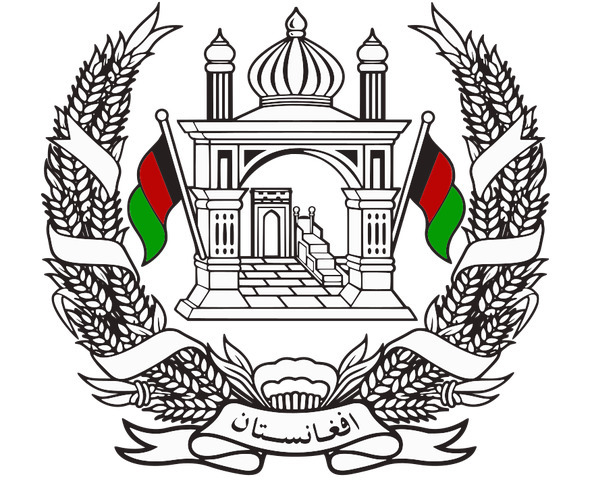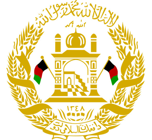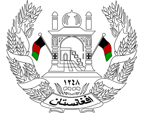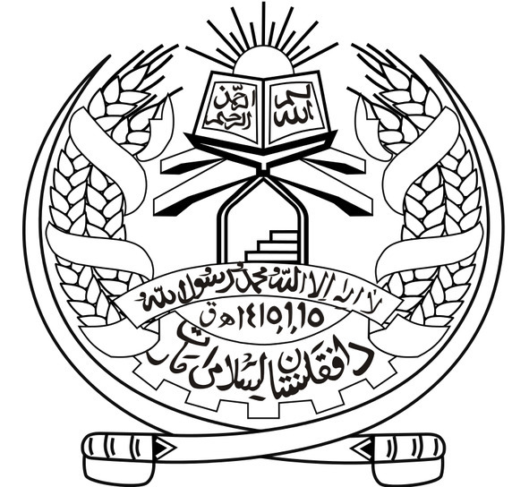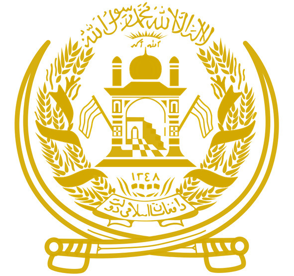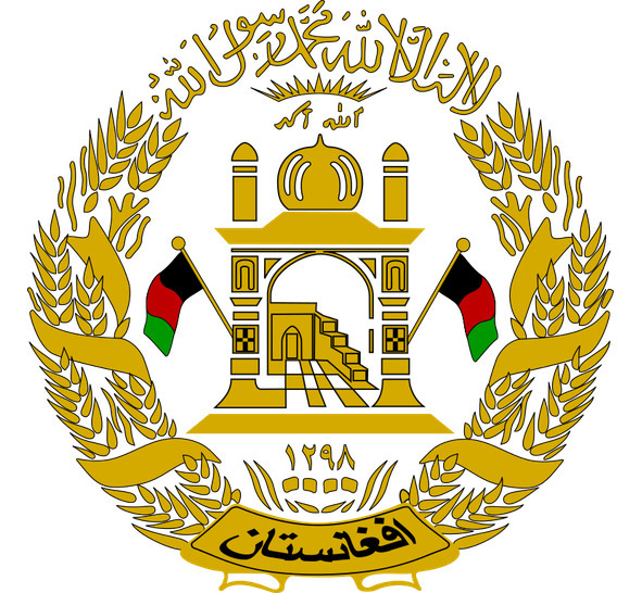 Пшеничные колосья перевиты лентой цветов флага, на нижнем витке ленты арабскими буквами написано название страны: «Афганистан».