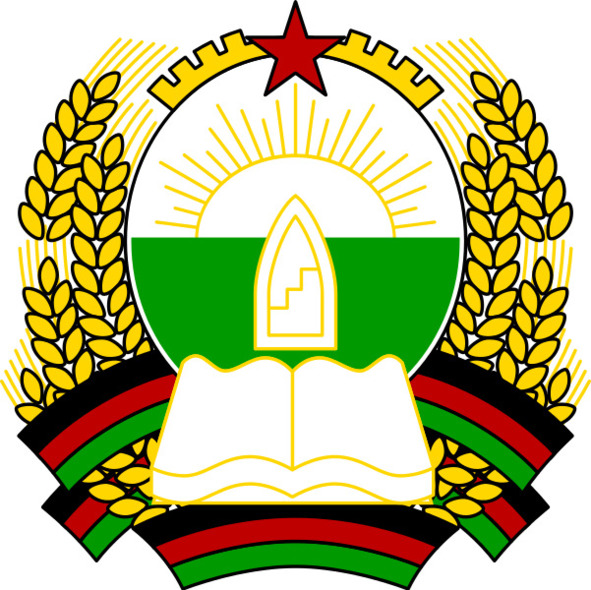 Однако в апреле свершился очередной государственный переворот и пришедший к власти Наджибулла 21 апреля 1980 г. учредил новый государственный герб. В верхней серебряной части его двучастного поля золотое восходящее солнце с чередующимися золотыми лучами разной длины; в нижней зеленой – золотая кафедра проповедника, под ней серебряная раскрытая книга. Обрамляют герб золотые колосья пшеницы, перевитые лентой цветов национального флага. Венчала герб пятилучевая звезда поверх части золотой шестерни.