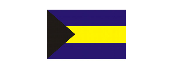 Флаг состоит из аквамариновой, золотистой и аквамариновой горизонтальных полос одинаковой ширины и черного треугольника у древка.