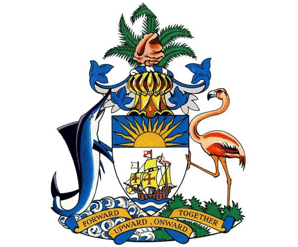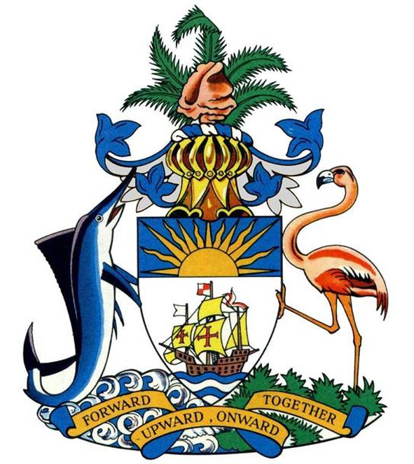 Щитодержателями являются розовый фламинго (слева) и голубой мерлин – типичные представители фауны страны и океана; их подножия – зеленая растительность болотистых заводей (места обитания фламинго) и голубые воды океана с серебряными барашками волн.