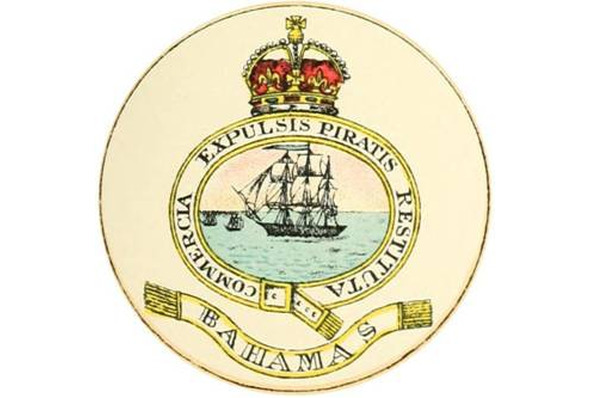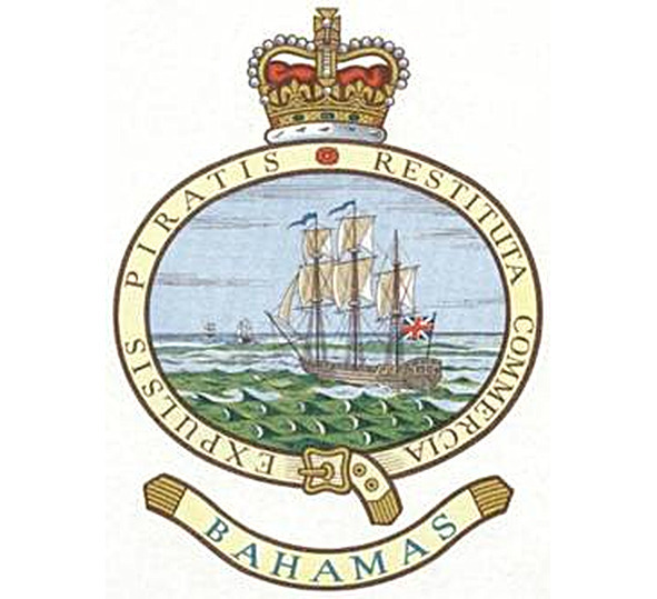 Хотя в XVII в. Великобритания и объявила острова своими владениями, но еще полтора века ей пришлось воевать за право обладания ими с Францией, Испанией и местными пиратами. Лишь к 1718 г. англичанам удалось очистить Багамы от пиратов и это событие стало основой для рисунка печати колонии, датируемой 1723 г., а затем и созданного в 1869 г. на ее основе колониального бэджа. Он представляет собой круглое поле, окруженное застегнутой подвязкой (подробнее об этом символе см. «Великобритания. Герб»), в котором изображена сцена преследования британским военным кораблем двух пиратских.