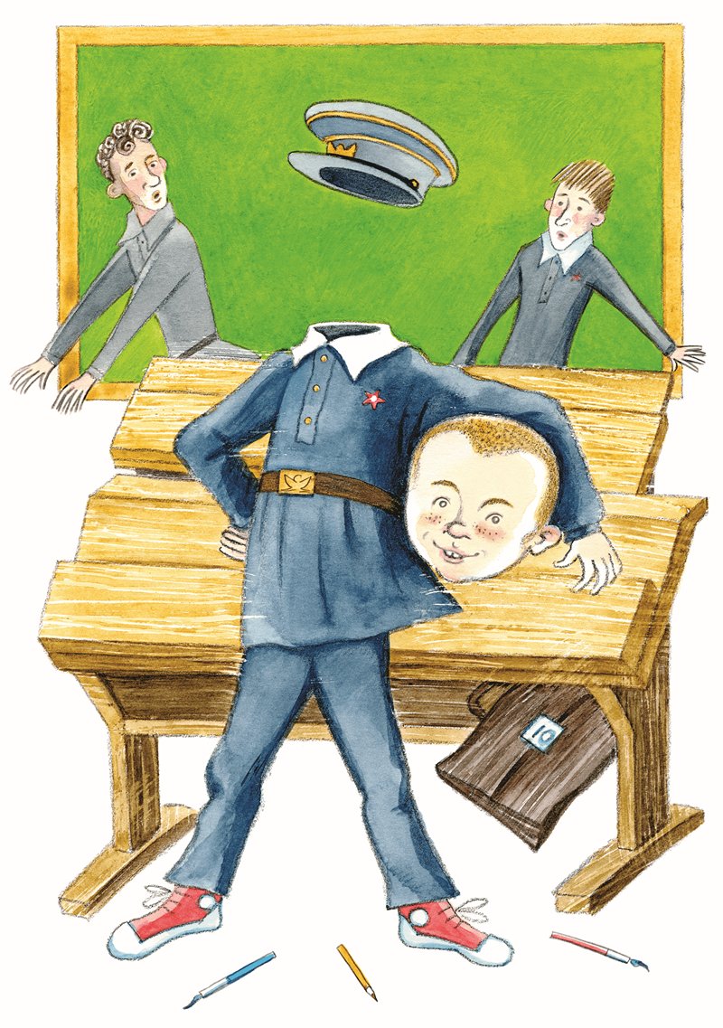 Смотрит он на кляксы и мечтает. Хорошо бы сделать так, чтобы голова отвинчивалась. Пришел бы в класс, спокойненько сел бы на свое место, отвинтил бы свою собственную голову и спрятал бы ее в парту. Идет урок. Ивана, конечно, не спрашивают: не может же человек без головы говорить! Ведь говорит-то он ртом, рот-то у него в голове, а голова – где?