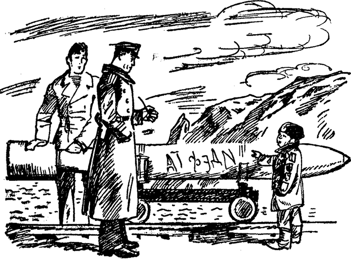 Около торпеды вертелся мальчишка лет восьми, худенький, с острым носиком, красный кончик которого был, пожалуй, ближе к безбровому лбу, чем к верхней губе. На мальчишке была большая, явно не по голове черная пилотка с блестящим якорем спереди, а на рукавах запачканной курточки красовались одна над другой нашивки минера, связиста, артиллериста, комендора, электрика и сигнальщика. Красные стрелы, пересекающиеся молнии, якоря, гаечные ключи, пушки, вымпелы… Нашивок было так много, что они едва умещались между плечом и потрепанным обшлагом, из которого вылезала худая грязная рука мальчика. Мальчуган деловито оглядывал вывезенную торпеду, обходил ее со всех сторон, затем садился перед ней на корточки и, шмыгая от усердия вздернутым носом, старательно выводил что-то пальцем на смазке, покрывавшей торпеду. Я подошел ближе. Сквозь розовато-коричневую пасту тускло поблескивала металлом протертая пальцем надпись: «АТ ФЭДИ». Косая перекладинка у буквы «и» была наклонена не в ту сторону, куда следует, буква поэтому выглядела как знак номера – №, и я догадался, что «э» получилось у мальчика тоже нечаянно.
