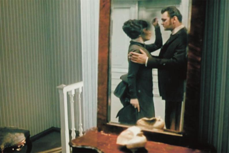 Он, поня́в её, скры́лся за две́рью. Она́ верну́лась на дива́н.