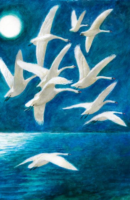 Лебеди стадом летели из холодной стороны в тёплые земли. Они летели через море. Они летели день и ночь, и другой день и другую ночь они, не отдыхая, летели над водою. На небе был полный месяц, и лебеди далеко внизу под собой видели синеющую воду. Все лебеди уморились, махая крыльями; но они не останавливались и летели дальше. Впереди летели старые, сильные лебеди, сзади летели те, которые были моложе и слабее. Один молодой лебедь летел позади всех. Силы его ослабели. Он взмахнул крыльями и не мог лететь дальше. Тогда он, распустив крылья, пошёл книзу. Он ближе и ближе спускался к воде; а товарищи его дальше и дальше белелись в месячном свете. Лебедь спустился на воду и сложил крылья. Море всколыхнулось под ним и покачало его. Стадо лебедей чуть виднелось белой чертой на светлом небе. И чуть слышно было в тишине, как звенели их крылья. Когда они совсем скрылись из вида, лебедь загнул назад шею и закрыл глаза. Он не шевелился, и только море, поднимаясь и опускаясь широкой полосой, поднимало и опускало его. Перед зарёй лёгкий ветерок стал колыхать море. И вода плескала в белую грудь лебедя. Лебедь открыл глаза. На востоке краснела заря, и месяц и звёзды стали бледнее. Лебедь вздохнул, вытянул шею и взмахнул крыльями, приподнялся и полетел, цепляя крыльями по воде. Он поднимался выше и выше и полетел один над тёмными всколыхавшимися волнами.