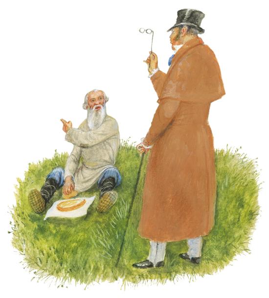 Ехал мимо этого поля барин и увидал, что старик сидит завтракает, а лошадь одна пашет. Барин вышел из кареты и говорит старику: