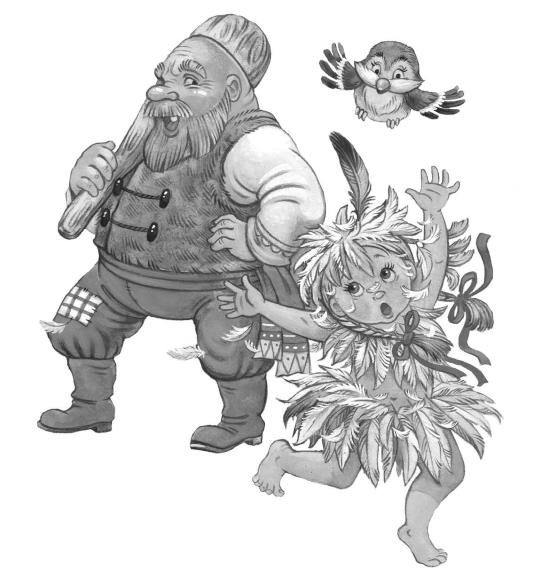 Одна девочка стерегла в поле корову. Пришли разбойники и увезли девочку. Разбойники привезли девочку в лес в дом и велели ей стряпать, убирать и шить. Девочка жила у разбойников, работала на них и не знала, как уйти. Когда разбойники уходили, они запирали девочку. Раз ушли все разбойники и оставили девочку одну. Она принесла соломы, сделала из соломы куклу, надела на неё свои платья и посадила у окна. А сама вымазалась мёдом, вывалялась в перьях и стала похожа на страшную птицу. Она выскочила в окно и побежала. Только что она вышла на дорогу, видит – навстречу ей идут разбойники.