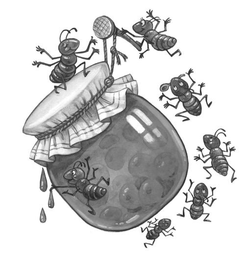 Один раз я пришла в кладовую достать варенья. Я взяла банку и увидала, что вся банка полна муравьями. Муравьи ползали и в средине, и сверху банки, и в самом варенье. Я вынула всех муравьёв ложечкой, смела кругом с банки и поставила банку на верхнюю полку. На другой день, когда я пришла в кладовую, я увидала, что муравьи с полу приползли на верхнюю полку и опять заползли в варенье. Я взяла банку, опять очистила, обвязала верёвкой и привесила на гвоздик к потолку.