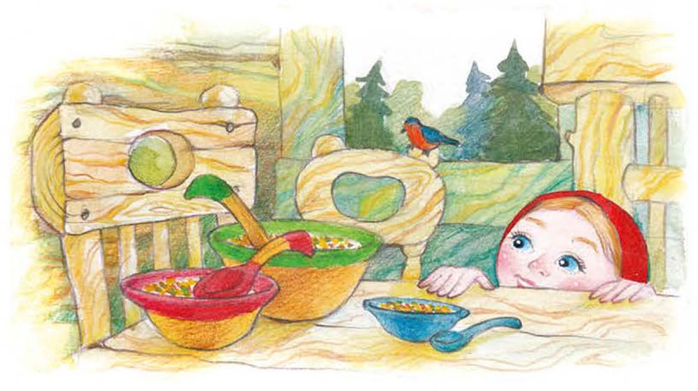 В домике было две комнаты: одна столовая, другая спальня. Девочка вошла в столовую и увидела на столе три чашки с похлёбкой. Первая чашка, очень большая, была Михайлы Ивановичева. Вторая чашка, поменьше, была Настасьи Петровнина; третья, синенькая чашечка, была Мишуткина. Подле каждой чашки лежала ложка: большая, средняя и маленькая.