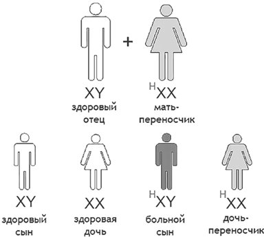 Гены, вызывающие развитие гемофилии и дальтонизма, находятся в негомологичном участке Х-хромосомы. У женщин каждый из этих генов подавляет парный ген, находящийся в другой Х-хромосоме, и потому заболевания не развиваются. «Хороший» парный ген не позволяет своему «плохому» собрату творить злые дела. А у мужчин Х-хромосома всего одна, и «плохой» ген в ее негомологичном участке подавлять-сдерживать некому. В результате развивается заболевание.