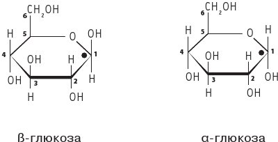 Глюкоза может существовать в виде α-глюкозы или β-глюкозы. Отличие между этими пространственными изомерами заключается в том, что при первом атоме углерода у α-глюкозы гидроксильная группа (—ОН) расположена под плоскостью углеродного кольца, а у β-глюкозы – над плоскостью.