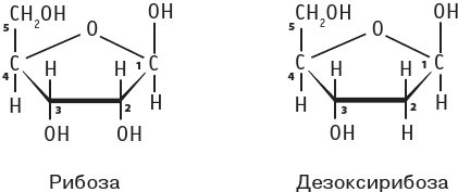 Мономерами нуклеиновых кислот служат нуклеотиды – соединения, в состав которых входят моносахарид дезоксирибоза или рибоза и азотсодержащее (азотистое) основание. Разница между двумя моносахаридами небольшая – всего в один атом кислорода. «Дезокси-» переводится с латыни как «отсутствие атома кислорода», то есть дезоксирибоза – это рибоза без одного атома кислорода.