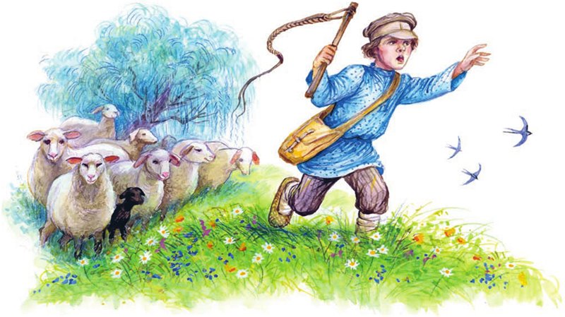 Тогда мальчик стал рассказывать, как было дело: из оврага выскочил большой волк, схватил ягнёнка, зарезал его и понёс.