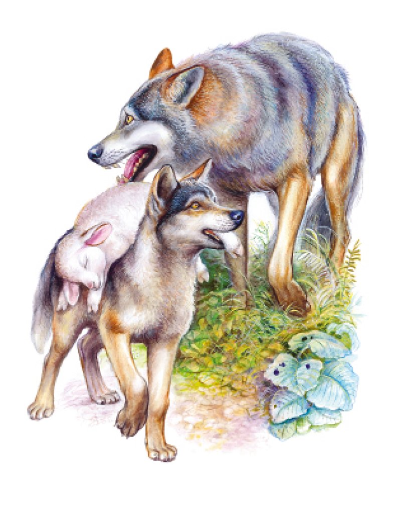 Навстречу выбежал волчонок и бросился к ягнёнку. Старый отдал нести ягнёнка молодому волку, а сам налегке побежал возле.