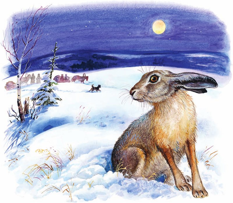 Зайцу нужно было перейти через большую дорогу, чтобы прийти на знакомое гумно. На большой дороге слышно было, как визжали полозья, фыркали лошади, скрипели кресла в санях.