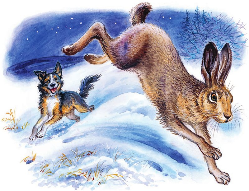 Когда обоз проехал, заяц перескочил дорогу и полегоньку пошёл к гумну. Собачонка от обоза увидала зайца. Она залаяла и бросилась за ним. Заяц поскакал к гумну по субоям[10]10
