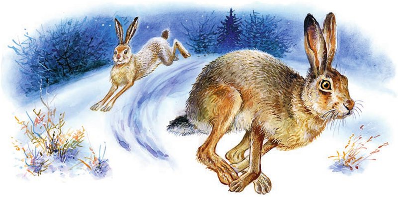 Заяц ходит ночью по полям и лесам без страха и прокладывает прямые следы; но как только приходит утро, враги его просыпаются: заяц начинает слышать то лай собак, то визг саней, то голоса мужиков, то треск волка по лесу, и начинает от страха метаться из стороны в сторону. Проскачет вперёд, испугается чего-нибудь и побежит назад по своему следу. Ещё услышит что-нибудь – и со всего размаха прыгнет в сторону и поскачет прочь от прежнего следа. Опять стукнет что-нибудь – опять заяц повернётся назад и опять поскачет в сторону. Когда светло станет, он ляжет.