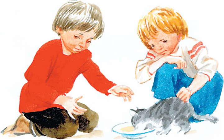 Были брат и сестра – Вася и Катя; у них была кошка. Весной кошка пропала. Дети искали её везде, но не могли найти. Один раз они играли подле амбара и услыхали – над головой кто-то мяу чит тонкими голосами. Вася влез по лестнице под крышу амбара. А Катя стоя ла внизу и всё спрашивала: «Нашёл? Нашёл?» Но Вася не отвечал ей. Наконец Вася закричал ей: