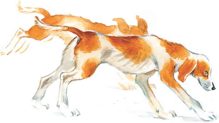 Вдруг они услыхали, что кто-то громко кричит: «Назад, назад!» – и увидали, что скачет охотник, а впереди его две собаки – увидали котёнка и хотят схватить его. А котёнок, глупый, вместо того, чтобы бежать, присел к земле, сгорбил спину и смотрит на собак. Катя испугалась собак, закричала и побежала прочь от них. А Вася что было духу пустился к котёнку и в одно время с собаками подбежал к нему. Собаки хотели схватить котёнка, но Вася упал животом на котёнка и закрыл его от собак.