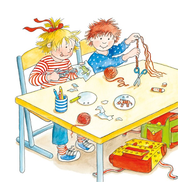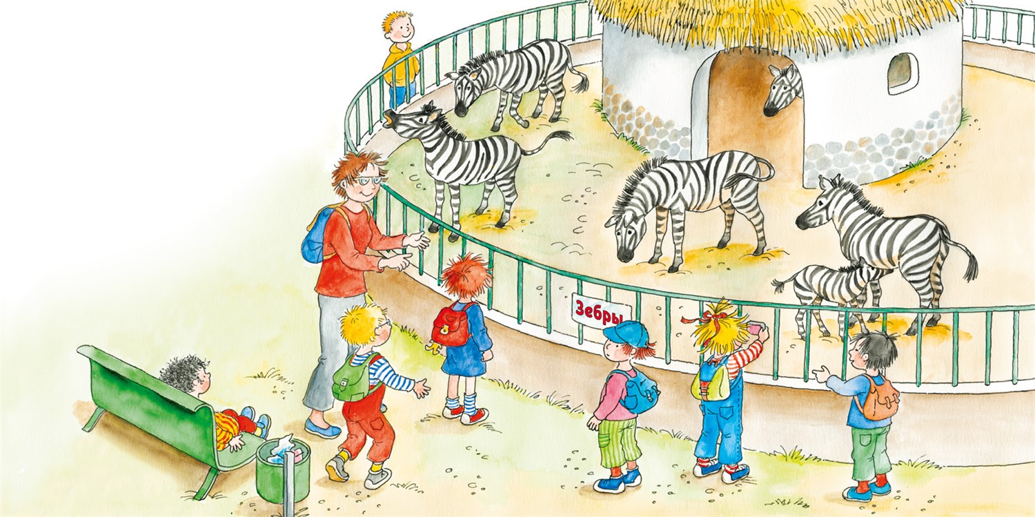 Дети рисуют каждый по зебре, вырезают их и приклеивают на картонные кружки с двумя дырочками у края. Конни с Юлией плетут разноцветные шнурки из ниток. Теперь картонку можно будет повесить на шею. На случай, если кто-то вдруг отстанет от группы, на обратной стороне картонки записаны телефоны и имена родителей каждого ученика. Конни очень ждёт эту поездку: наконец-то она вживую увидит всех зверей!
