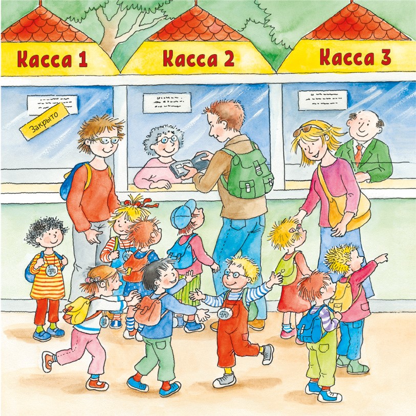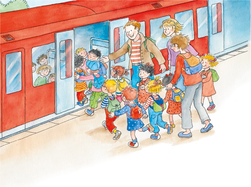 Когда электричка останавливается у платформы, дети шумной толпой заходят в вагон. Ехать им совсем недалеко – вскоре уже видны высокие дома большого города. На Центральном вокзале класс сходит с электрички и пересаживается на метро. И вот наконец они у кассы зоопарка. Господин Вебер покупает на всех билеты.