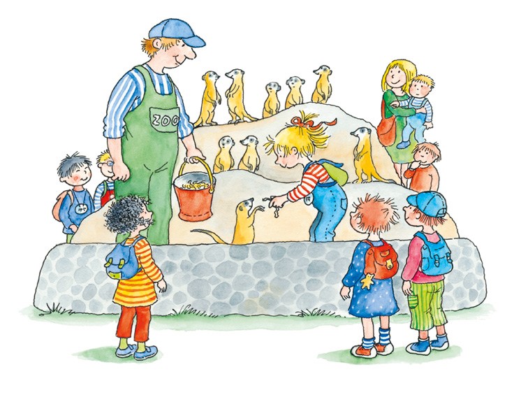 У входа их уже ждёт господин Лоренц – смотритель зоопарка. Он проведёт экскурсию. Первым делом дети идут к сурикатам. Их как раз собираются кормить. Настоящими червяками!