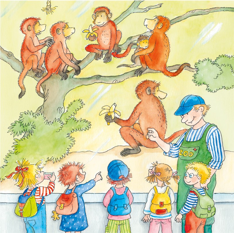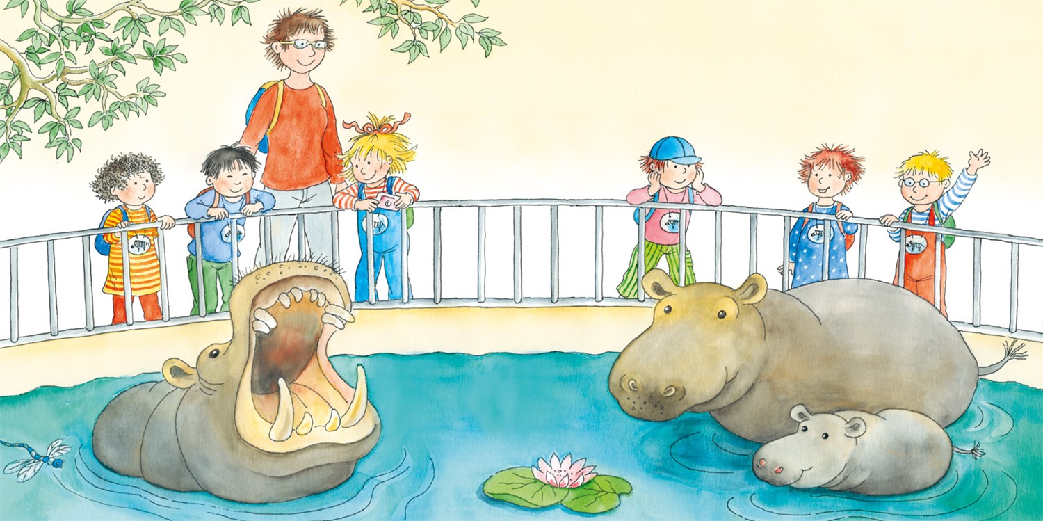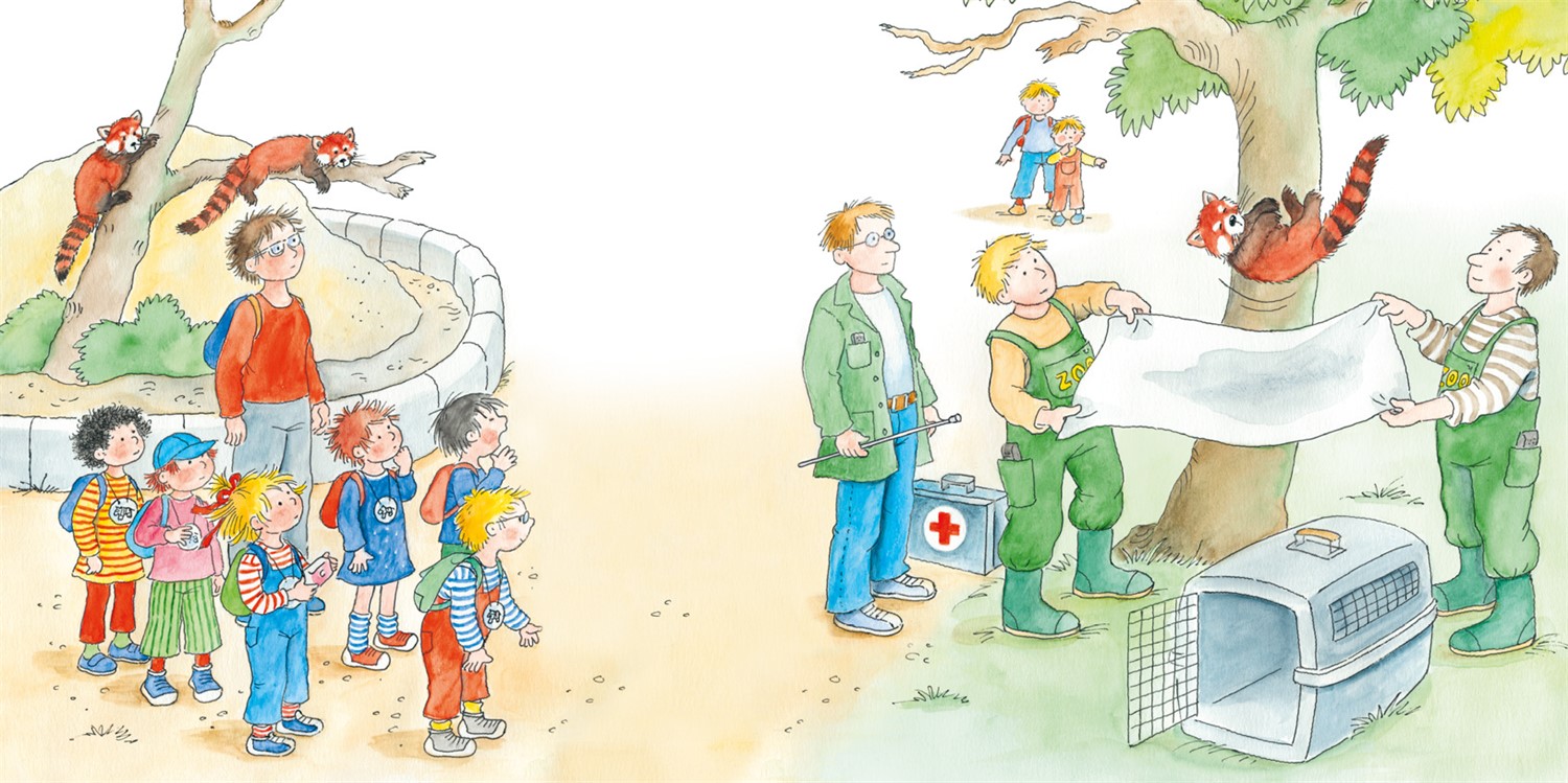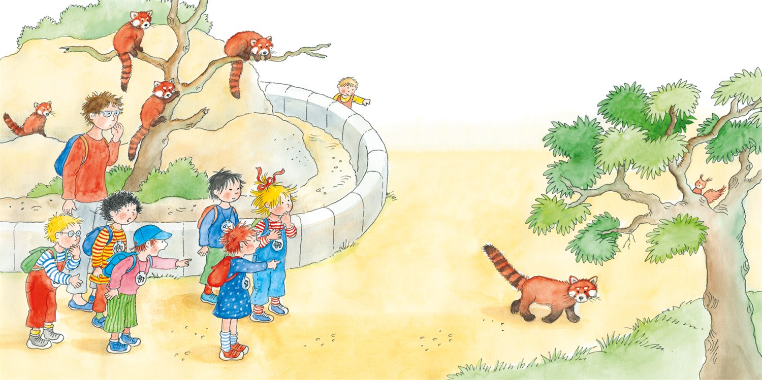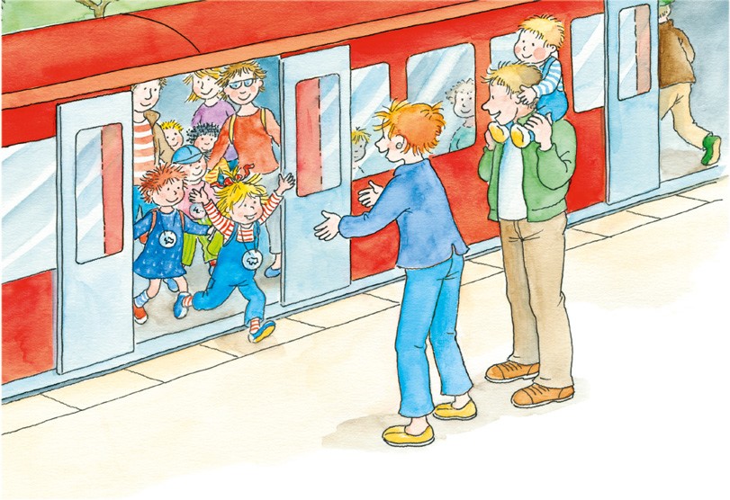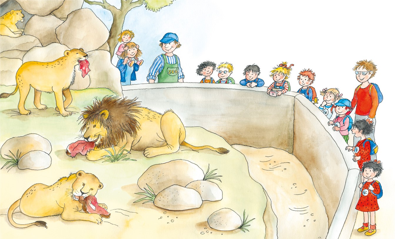 Утром в четверг папа провожает Конни на электричку. На платформе, подпрыгивая от волнения, уже собрались все её одноклассники. Госпожа Зоммер, классная руководительница, надевает на каждого ребёнка его самодельную бирку и пересчитывает всех. Вместе с классом в зоопарк едут мама Лены и ещё один учитель, господин Вебер.