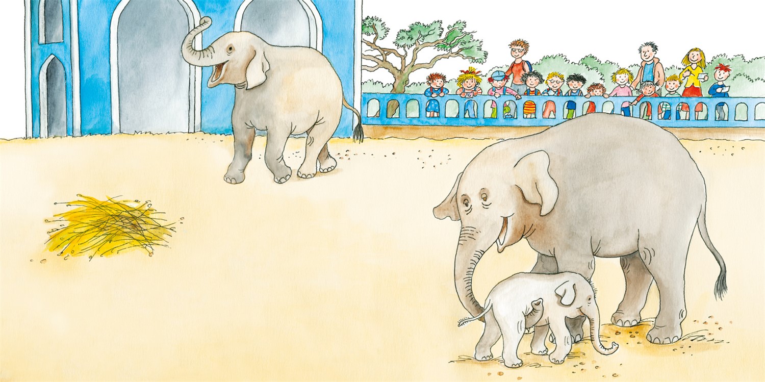 У него ещё нет имени, и посетители могут предлагать свои варианты. За лучшее имя полагается награда – годовой абонемент в зоопарк. Все дети сразу же принимаются обсуждать, как же назвать слонёнка. Носик? Элиф? Малыш-хобот?