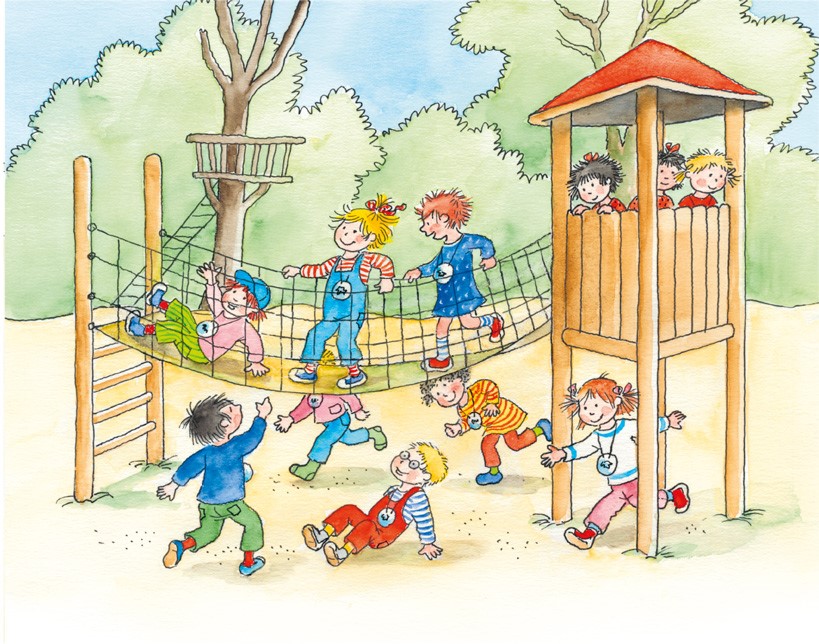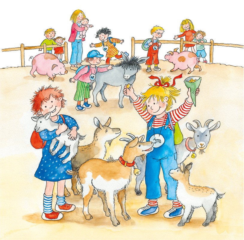 Наконец все добрались до загона с домашними животными. Юлия бежит гладить маленького козлёнка. А Конни покупает пакетик с кормом, и вокруг неё сразу собирается несколько козочек, выпрашивая еду. Покормив их, ребята идут на детскую площадку. Они бросают рюкзаки в кучу и бегут к игровому комплексу. Все остальные дети из их класса уже здесь. Скоро они поедут домой.