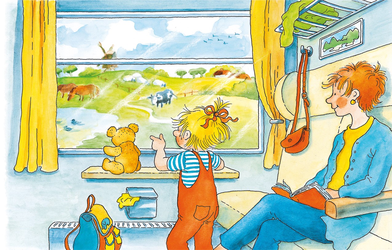 Наконец-то каникулы! В первый же день Конни с мамой садятся на поезд и едут в деревню к тёте Грете. Папа остался дома – ему надо работать. Конни сидит и с интересом смотрит в окно. Мимо пролетают ухоженные домики, жёлтые поля и зелёные деревья. На пастбищах пасутся чёрно-белые коровы. А на соседнем лугу резвятся лошадки. Ой, а вон бегают лохматые овечки!