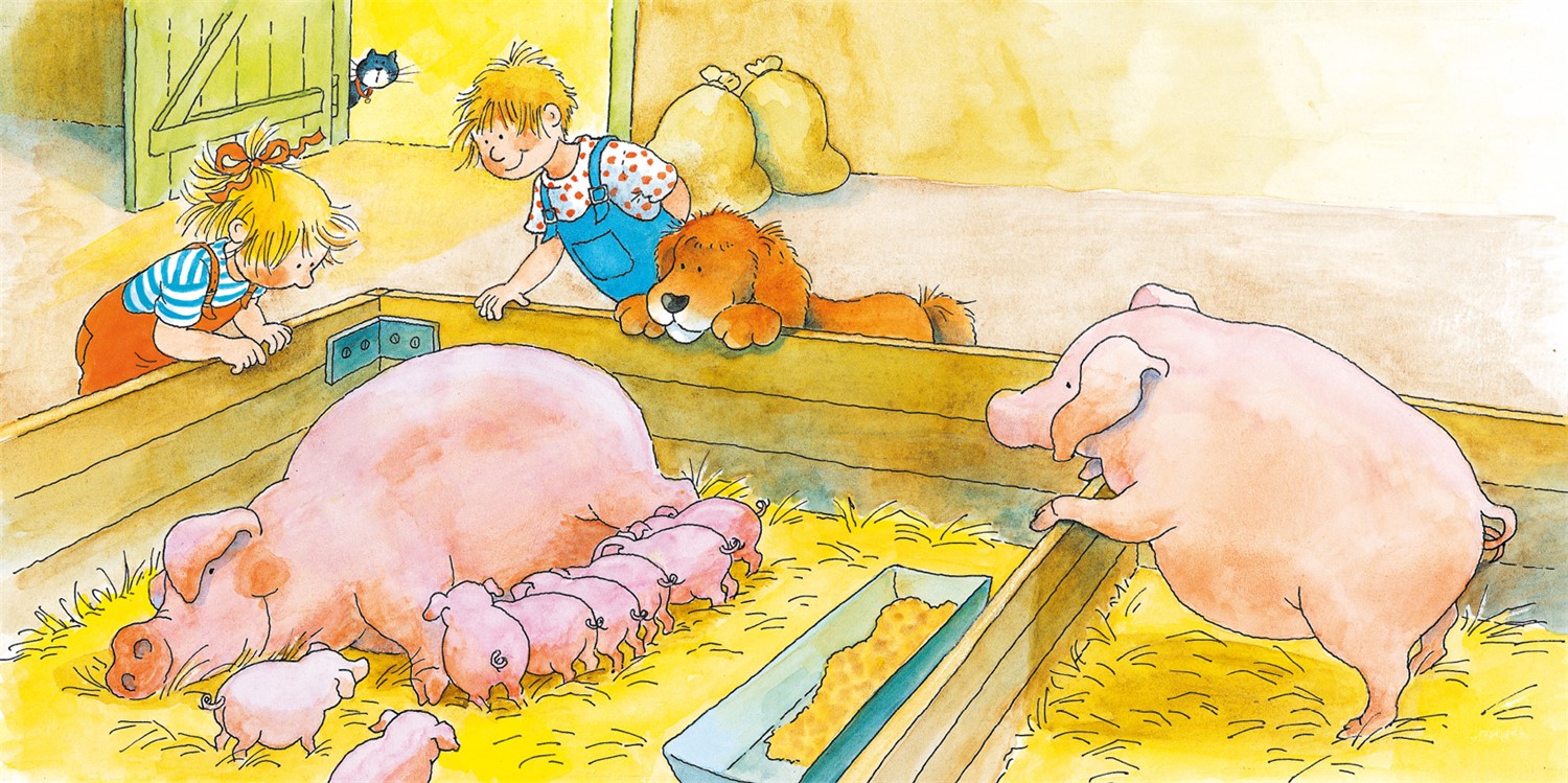 В коровнике никого нет – днём все коровы пасутся на лугу. Только кот Пих трётся о ноги Конни и тихо мурлычет. В свинарнике на боку дремлет большущая мама-свинка, а рядом с ней – восемь поросят.