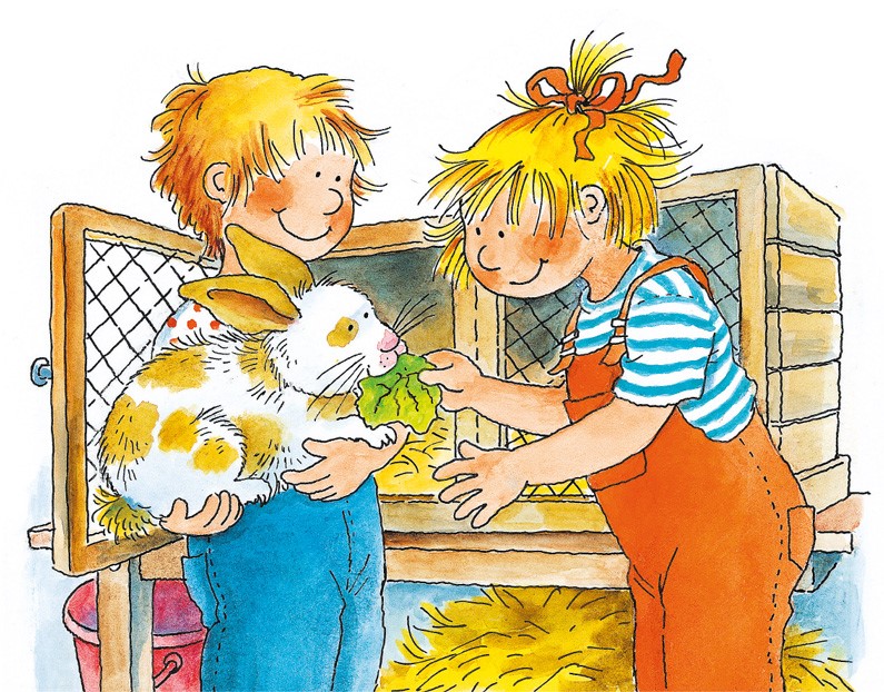 Анника ведёт Конни к клеткам с кроликами. Девочки кормят длинноухих зверьков листьями одуванчика и салата.