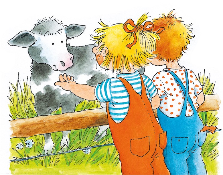 Девочки идут на лужайку за конюшней. Там пасётся телёнок. Конни макает палец в миску с молоком, которая стоит у забора, и протягивает телёнку. Он тут же начинает сосать его – прямо как малыш сосёт молоко из бутылочки.