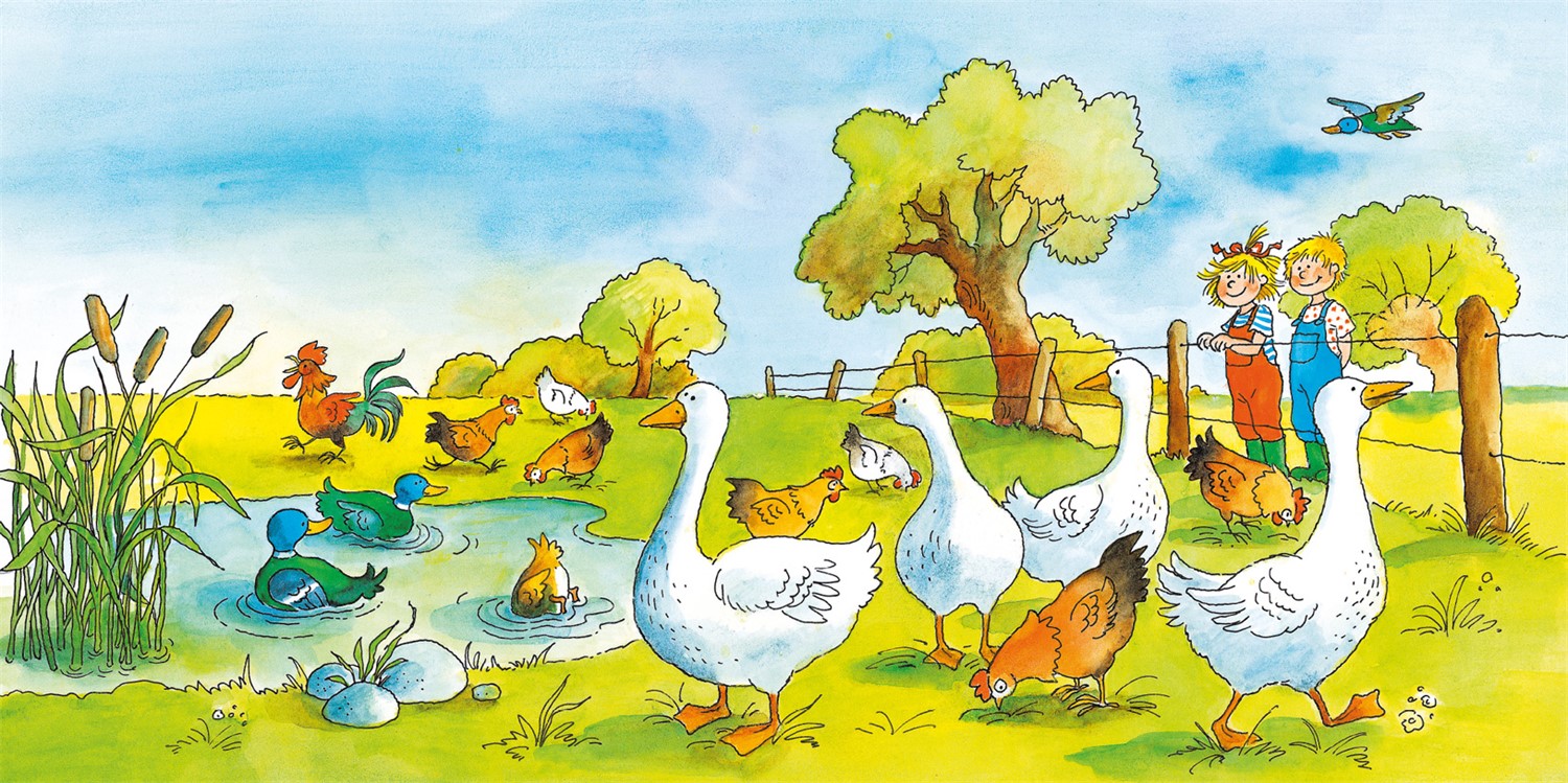 На пруду плавают и ныряют утки, а гуси, неуклюже переваливаясь с боку на бок, неспешно прогуливаются по лугу. Мимо них бегают куры. Они копают лапками землю и что-то клюют. Чуть дальше в большой луже разлеглись свинки.