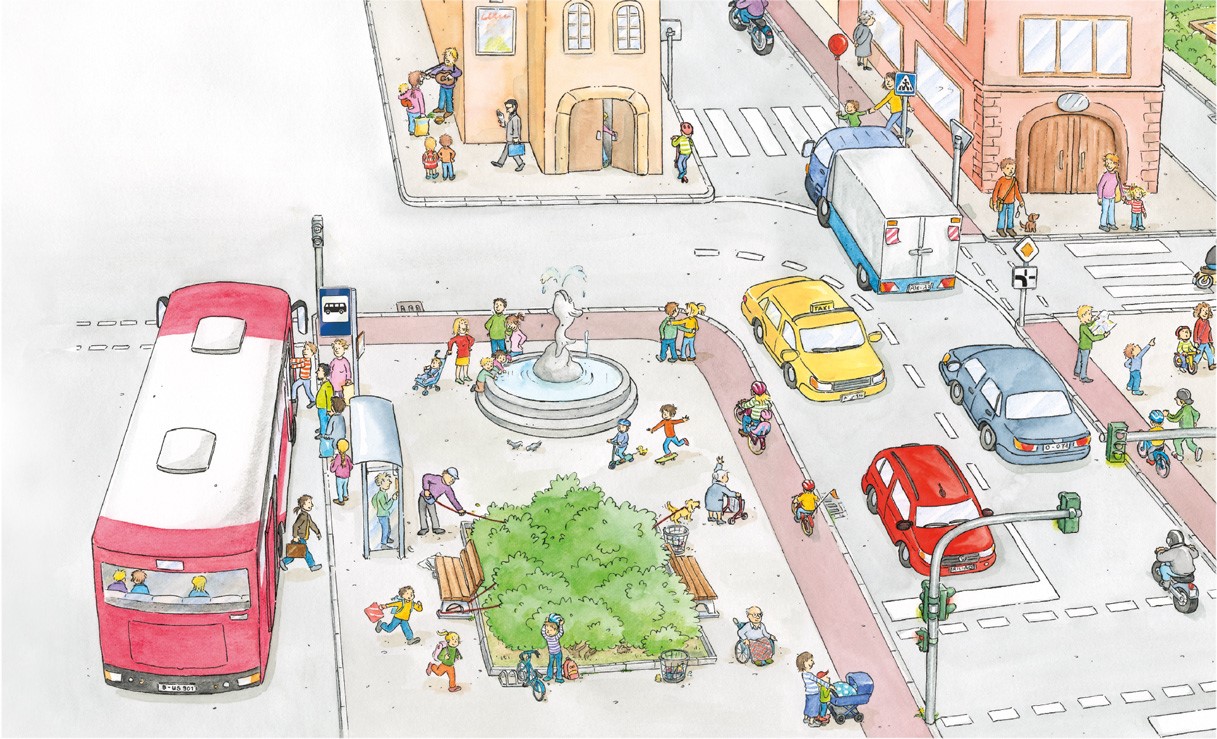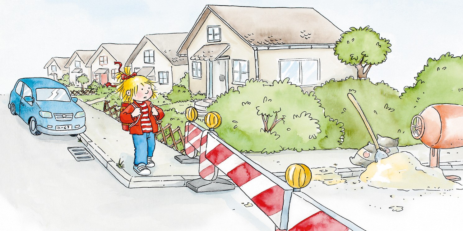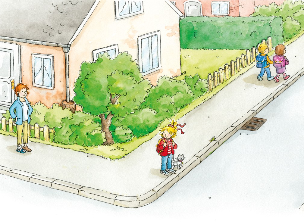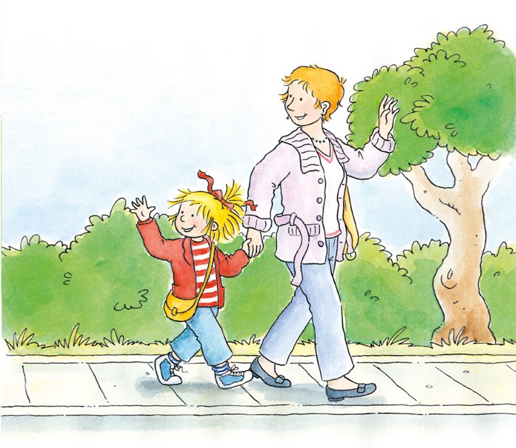 Сегодня Конни идёт в детский сад самостоятельно. Чтобы попасть туда, ей надо перейти дорогу. Конни останавливается на краю тротуара и смотрит сначала налево, потом направо. Потом снова налево. Машин нет! Можно переходить дорогу.