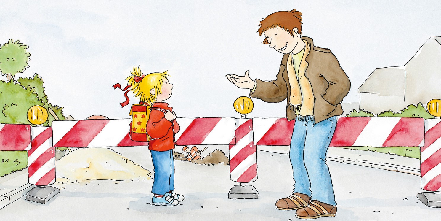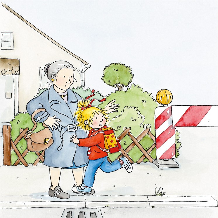 На углу следующей улицы Конни встречается с Юлией и её мамой, и все вместе они продолжают путь в детский сад. Остановившись у пешеходного перехода, Конни и Юлия смотрят налево, направо и снова налево. И поднимают руку, чтобы водители точно заметили, что они собираются переходить через дорогу.