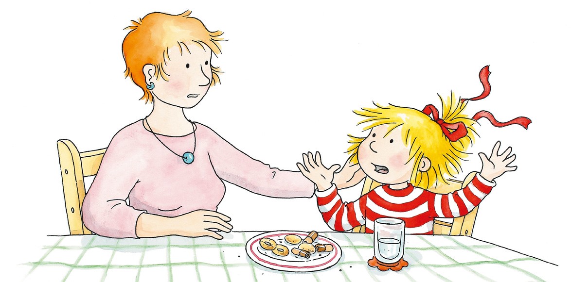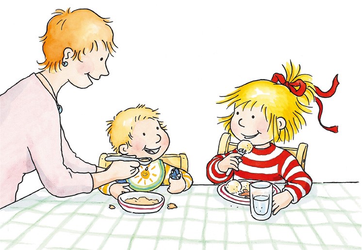 Только сейчас Конни чувствует, как сильно проголодалась. Мама ещё раз подогревает обед и накрывает на стол. Конни с удовольствием ест мамины вкусные фрикадельки и сияет от гордости за то, что сегодня всё сделала правильно и её похвалили. Мама тем временем кормит Якоба, который как раз проснулся и тоже хочет есть.
