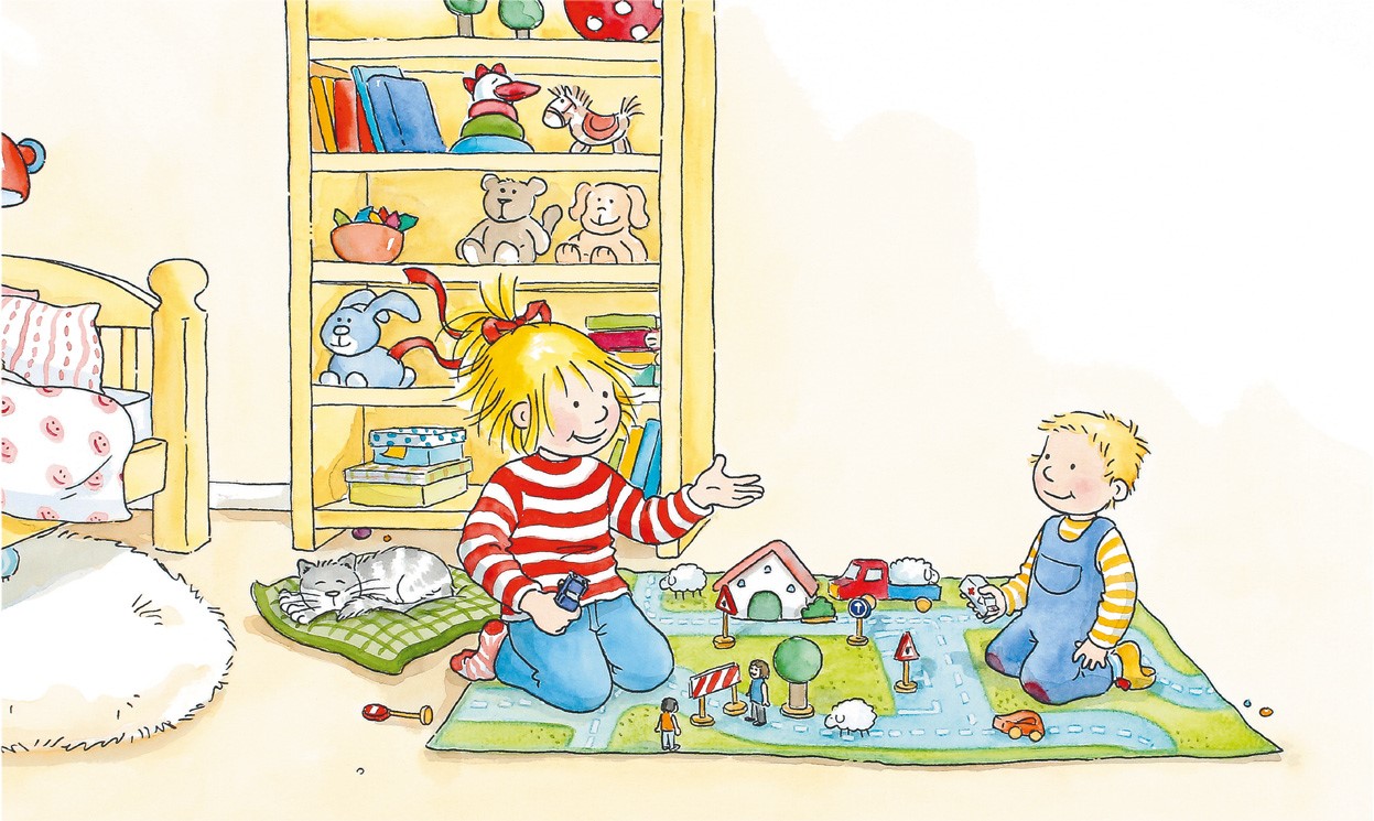 После обеда Конни играет с Якобом. Они катают машинки по дорогам на ковре, а маленькие человечки служат пешеходами. Вдруг Конни перекрывает улицу.