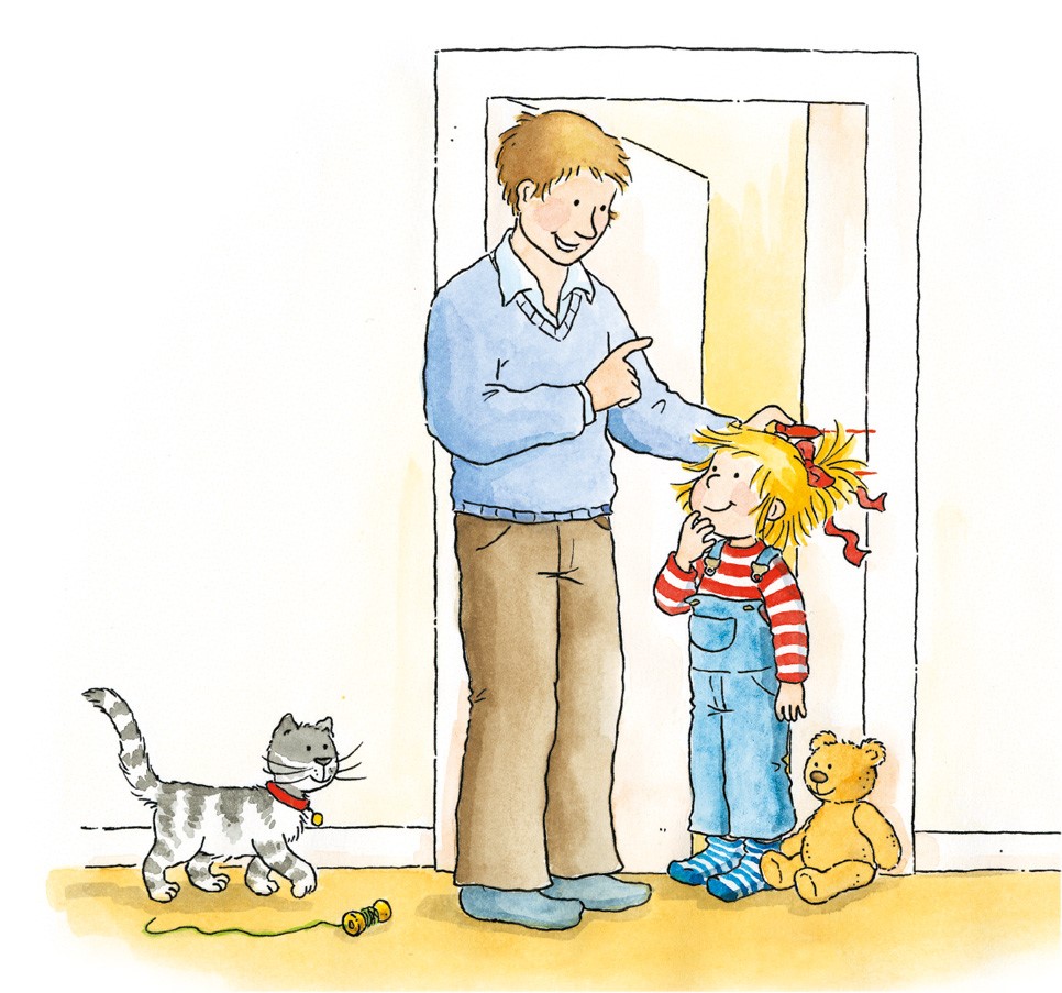 Папа с Конни идут к двери в её комнату: там они сделали отметку красным карандашом, когда в прошлый раз измеряли рост.