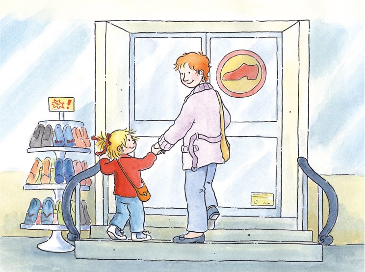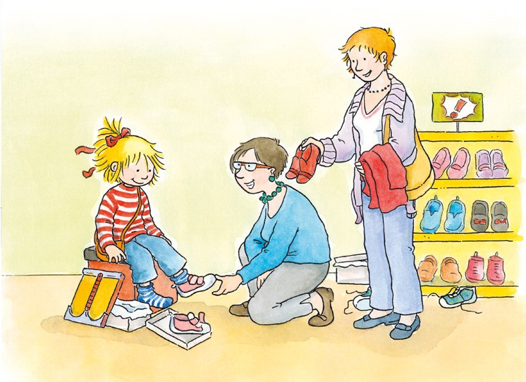 Продавец проверяет размер ног Конни. Действительно, Конни нужны новые ботиночки! Мама вместе с продавцом снимает с полок пару за парой. А Конни приходится всё это мерить. Красные ботиночки ей не нравятся. А белые с розовым жмут.