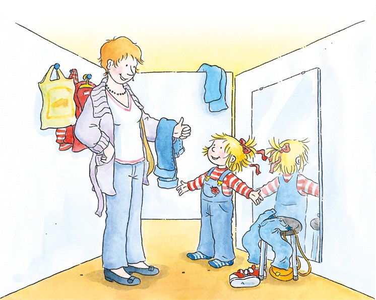 В отделе детской одежды мама берёт две пары джинсов, комбинезон и идёт вместе с Конни в примерочную. По пути они замечают очень красивую кофточку в полоску и берут её тоже.