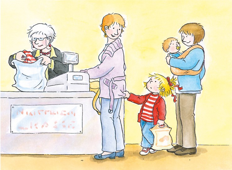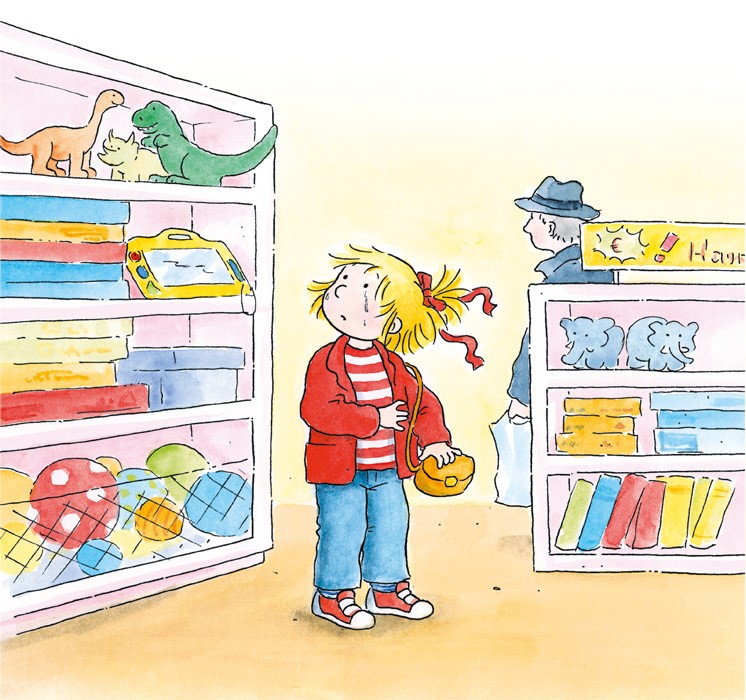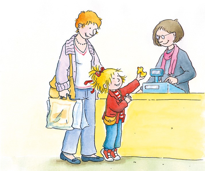 Вместо этого они заходят в маленький магазинчик за углом. Там Конни покупает для Якоба жёлтенькую уточку-пищалку. И сама платит за неё два евро, которые ей подарила бабушка! Конни гордо несёт пакетик с подарком в правой руке, а левой крепко держится за маму. Так, на всякий случай.