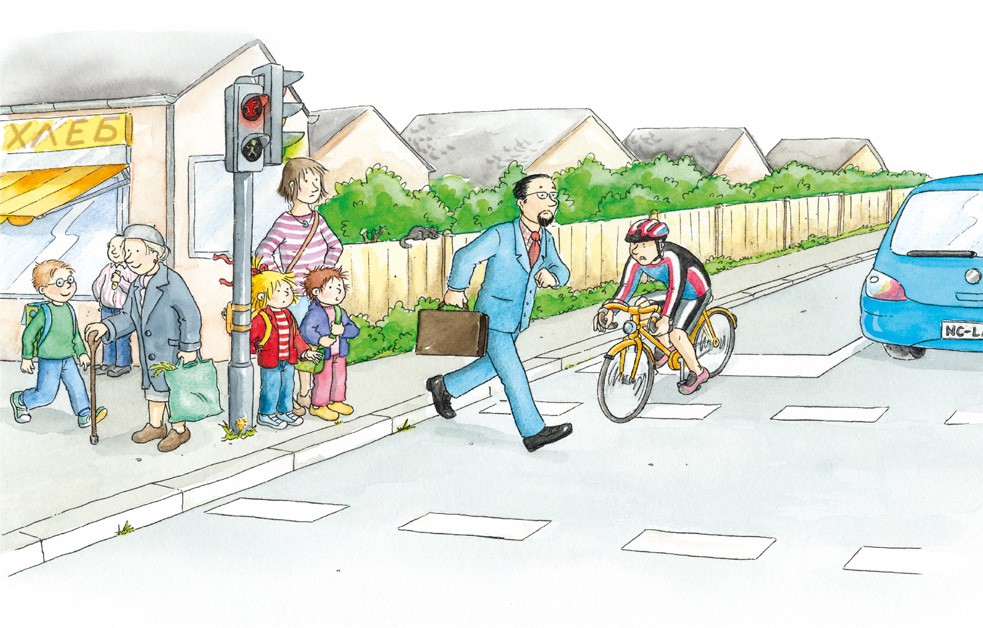 Переход на углу булочной оборудован светофором. Конни нажимает кнопку и вместе с Юлией спокойно ждёт, когда загорится зелёный. Но какой-то мужчина торопится и перебегает дорогу на красный свет. При этом он чуть не попадает под колёса велосипедисту. Тот едва успевает затормозить. Если ты уже на переходе и светофор вдруг загорается красным, быстрее иди дальше. Ни в коем случае не беги обратно!