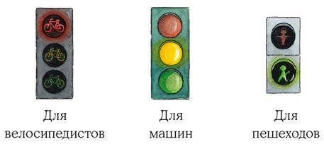 Светофоры могут выглядеть по-разному. У пешеходных есть только два цвета: красный человечек наверху, зелёный внизу. У светофоров для автомобилистов и велосипедистов – три цвета: красный, жёлтый и зелёный. Жёлтый означает: «Внимание! Сейчас цвет сменится».