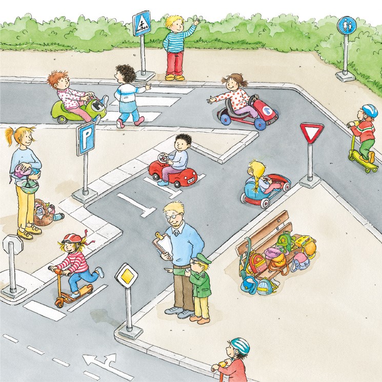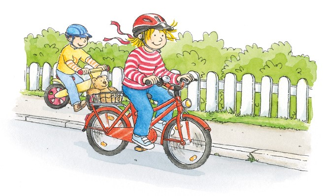 Конни с подругой идёт на игровую площадку. Её обгоняет Леон на своём скейтборде и едва не врезается на полной скорости в проходящую мимо женщину. «Повнимательнее!» – кричит та. Леон съезжает на велосипедную дорожку. Но там ему сигналит велосипедист. Ведь велосипедная дорожка – только для велосипедистов. По ней нельзя ездить на роликах, скейтборде или самокате. А вот пешеходной дорожкой, или тротуаром, могут пользоваться не только пешеходы.